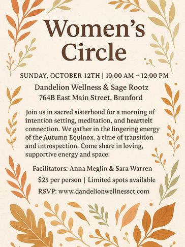 Join us in sacred sisterhood for a morning of intention setting, meditation, and heartfelt connection. We gather in the lingering energy of the Autumn Equinox, a time of transition and introspection. Come share in loving, supportive energy and space.