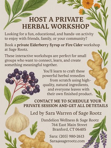 Looking for a fun, educational, and hands-on activity to enjoy with friends, family, or your community? Book a private Elderberry Syrup or Fire Cider workshop at Sage Rootz. These interactive workshops are perfect for small groups who want to connect, learn, and create something meaningful together.